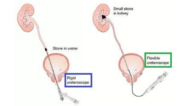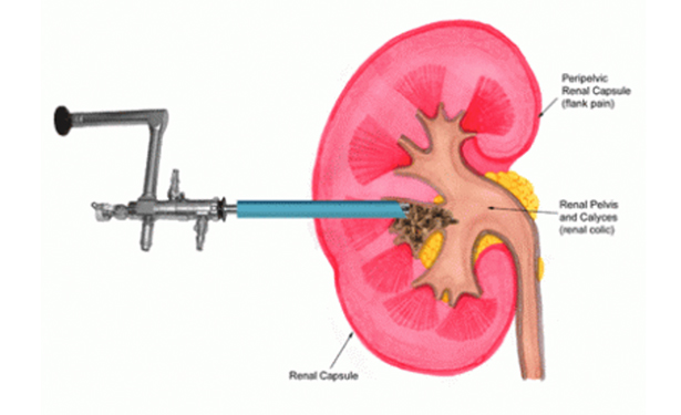 Técnica quirúrgica que consiste en un acceso retrógrado desde la uretra hasta el uréter y el riñón para localizar el cálculo y destruirlo mediante energía láser. Pueden ser instrumentos semirrígidos (para tratar cálculos en uréter) o flexibles (para tratar cálculos renales). Las posibles complicaciones que pueden aparecer son lesión ureteral, estrechamiento del uréter, que quede un fragmento litiásico ureteral, infección, hematuria (orina en sangre), fiebre, etc.